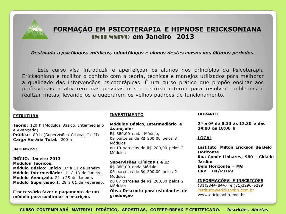 A regressão de idade é uma ferramenta muito útil no tratamento da fobia, pânico, baixa auto-estima, traumas da infância. Atualmente existem várias e efetivas formas de regressão de idade. O curso possibilitará ao participante incorporar algumas das técnicas à sua prática clínica. Profissionais bem formados nestas técnicas podem utilizá-las, obtendo resultados de profunda modificação para o bem-estar dos pacientes, auxiliando-os a encontrar caminhos de vida mais saudáveis.